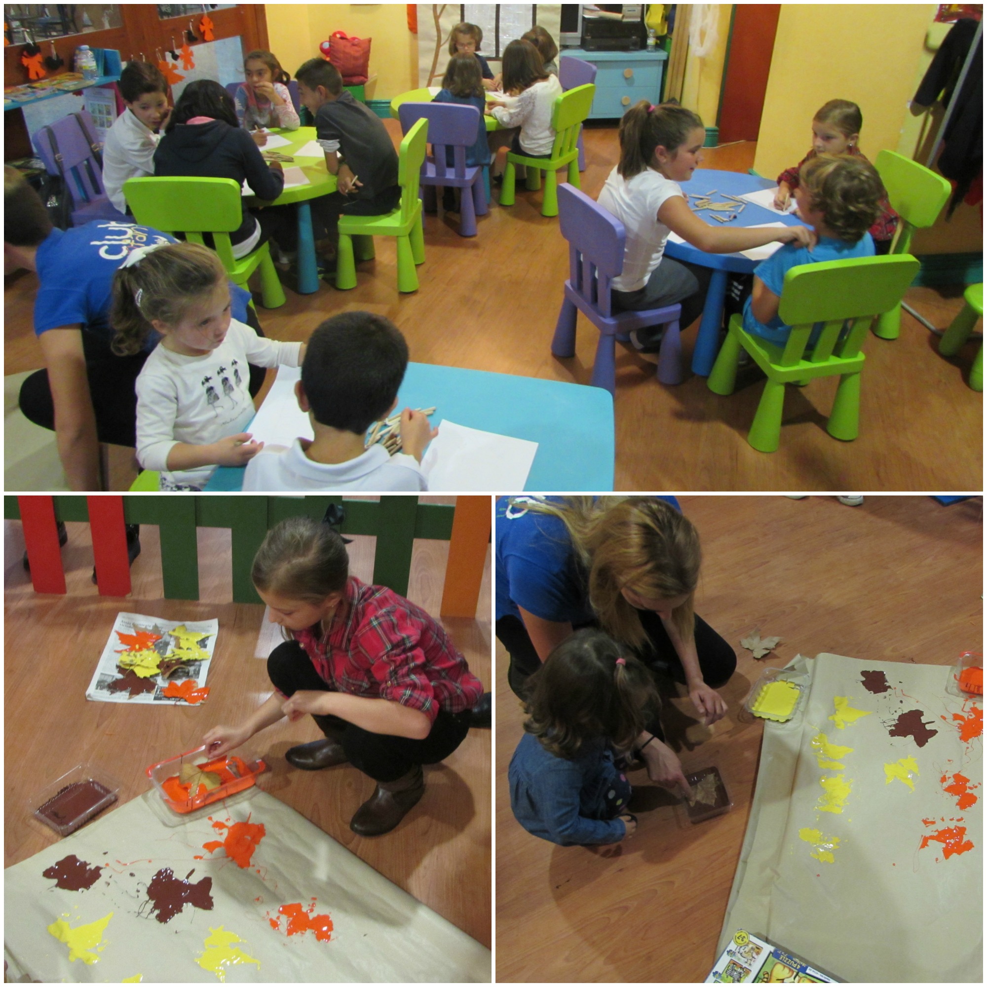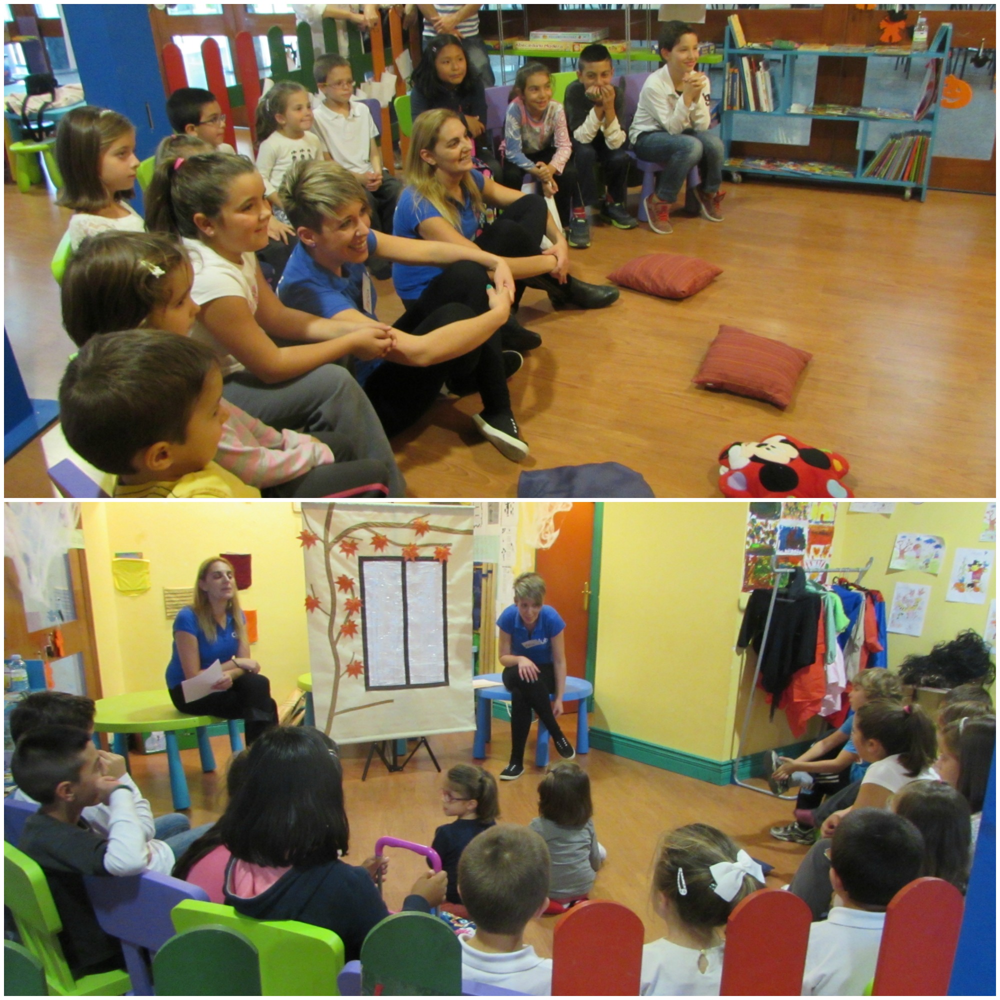 Ocio educativo y #solidaridad en la narración del cuento de «Las tres hojitas en la pared» correspondiente al libro “¿Qué me pasa Ntumba?”. Posteriormente los niños han realizado un dibujo sobre el cuento y un mural con estampaciones de hojas para recordar a Katiuska, la protagonista, y no olvidar nunca que hay niños que sufren enfermedades.