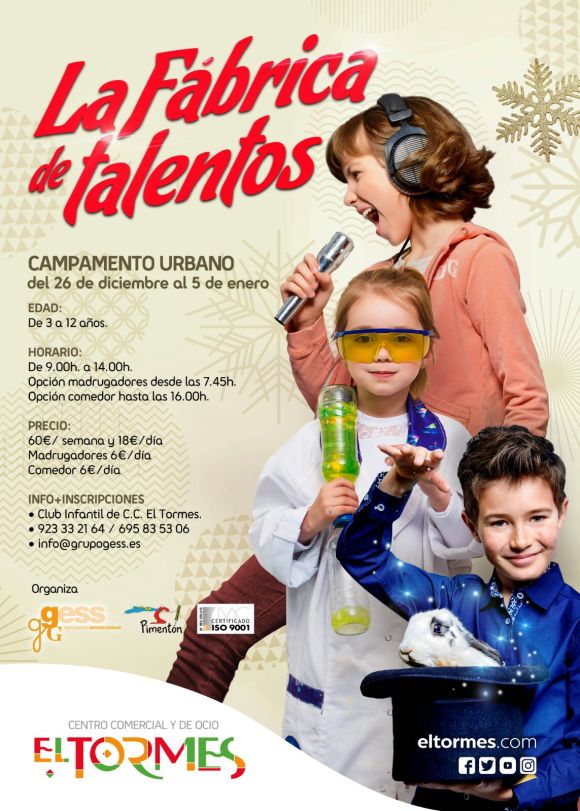 El Centro Comercial El Tormes ya tiene todo preparado para el Campamento Urbano de Navidad que se celebrará entre el 26 de diciembre y el 5 de enero y que en esta ocasión consistirá en un especial “Got Talent”. A través de diferentes actividades se propiciará que los niños descubran su talento (o talentos) de tal forma que puedan seguir cultivándolo y utilizándolo en su día a día además de adaptarlo a otros aspectos de su vida. Se trata de una propuesta de trabajo en equipo que les ayude a valorar las habilidades con las que cuentan cada uno de los participantes y todo ello a través de diferentes actividades: musicales, deportivas, de animación a la lectura, culturales, científicas, culinarias y creativas. Además no faltarán la lógica y las matemáticas, el medio ambiente, el inglés y, sobre todo, el juego. Será un campamento dinámico y divertido, donde se tratará de descubrir los talentos que los pequeños llevan dentro.