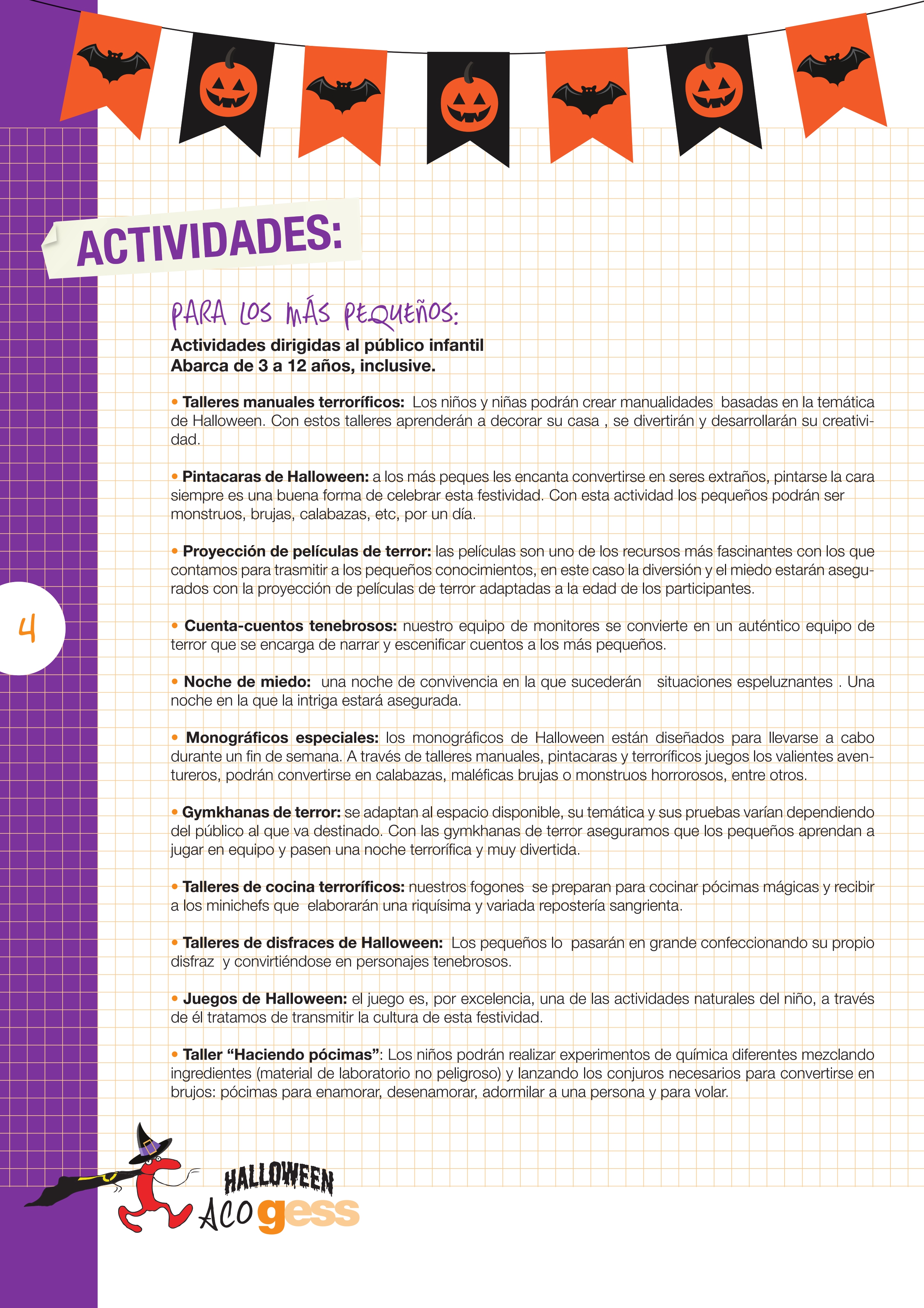 Si algo nos caracteriza en GRUPO GESS es que ofrecemos actividades, para todos los gustos, en las cuales dejamos salir toda nuestra creatividad, juegos aterradores, recetas espeluznantes, manualidades terroríficas, cuentacuentos monstruosos, pintacaras diabólicos y un sin fin de servicios personalizados, para que este Halloween sea único .